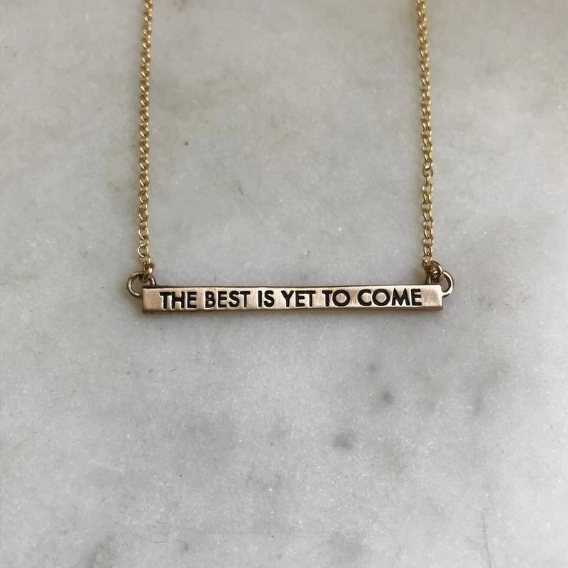 Wear The Best Is Yet To Come Necklace as a daily reminder to keep on keepin’ on. This bar necklace features a hand-stamped stamped bronze pendant on a 18″ gold filled chain.