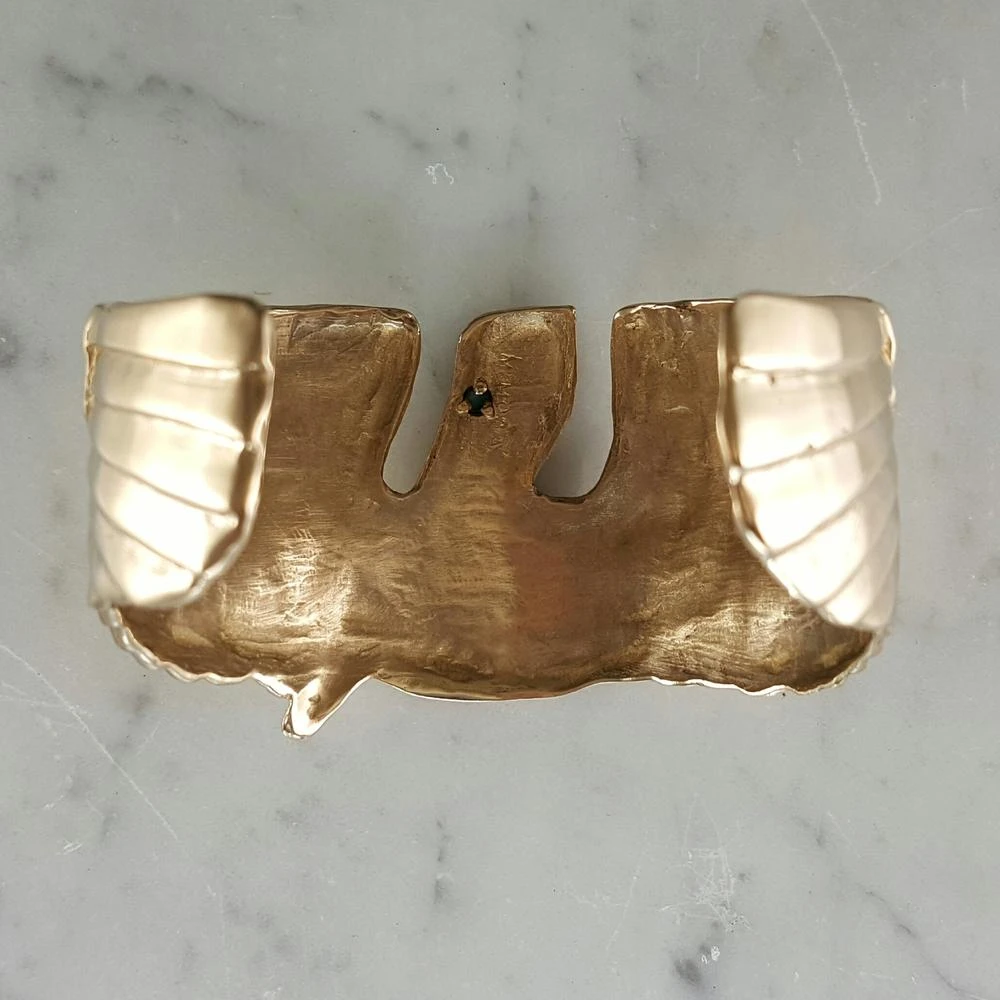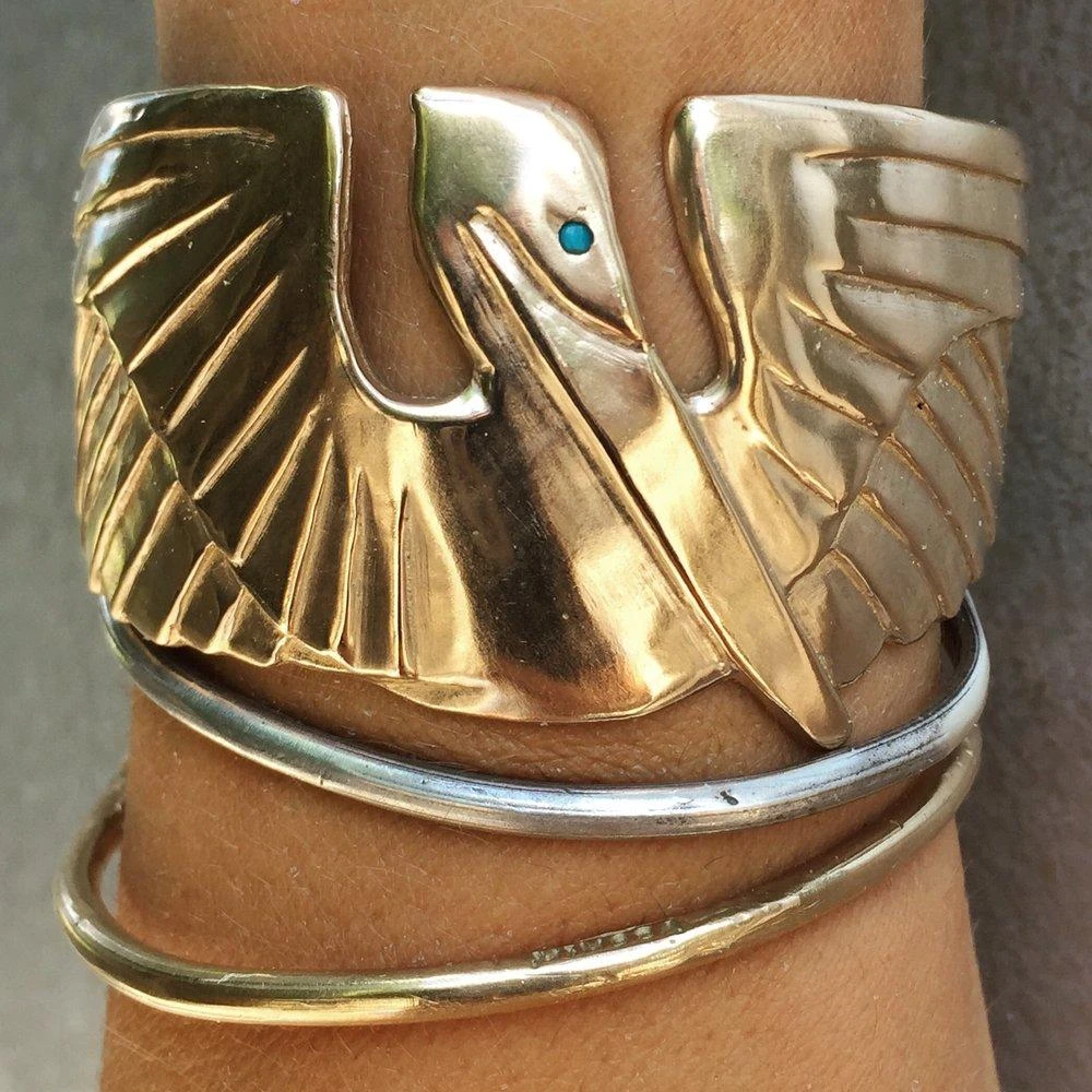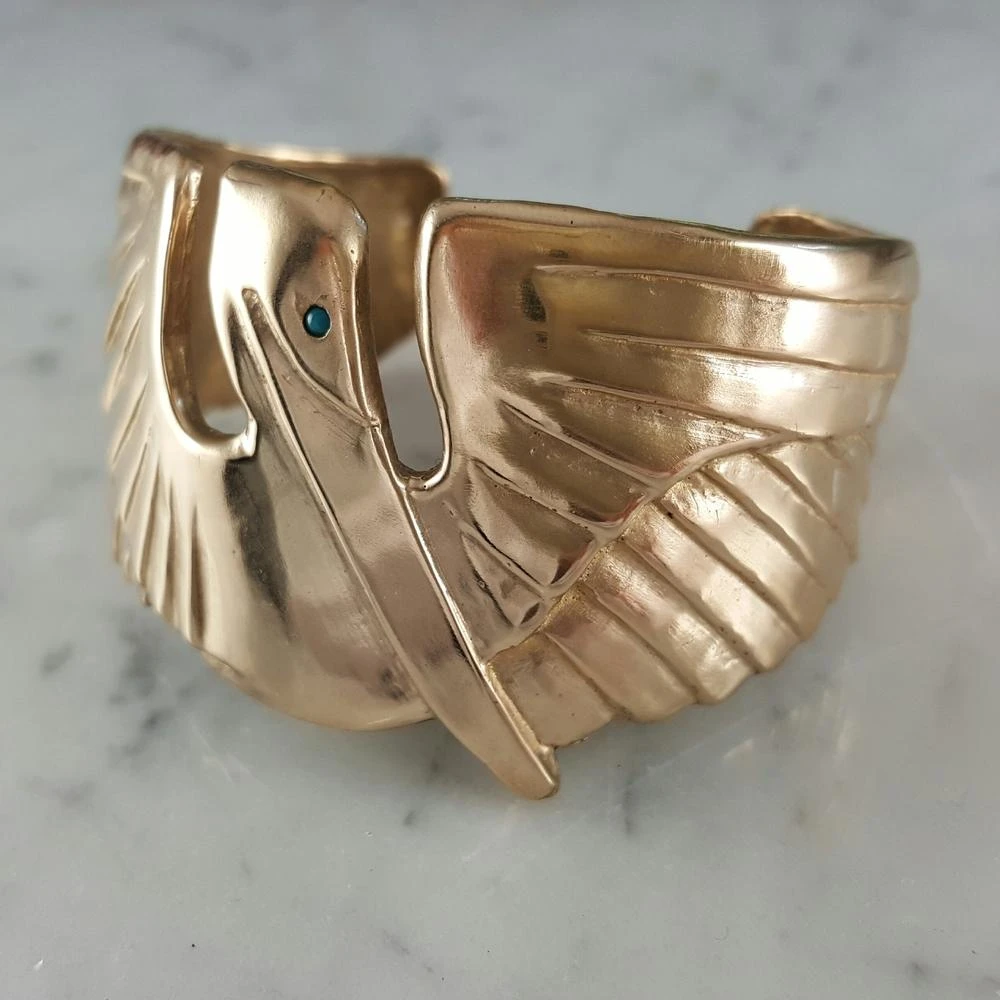 Take Flight in the signature Pelican Cuff with a beautiful inset turquoise eye. Let the Louisiana State Bird nest comfortably on your wrist.Â