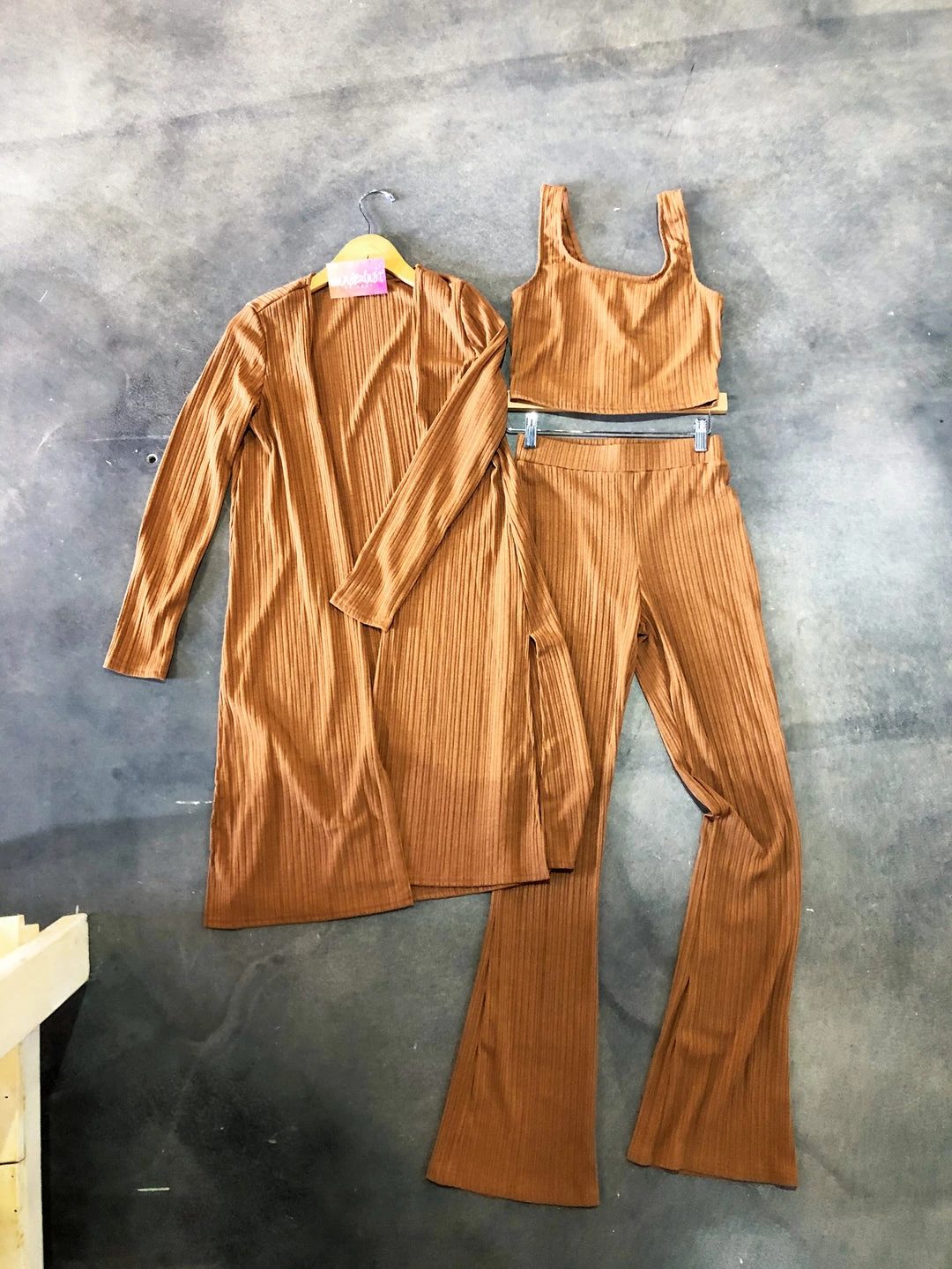3 Piece Ribbed Top, Midi Cardigan, And Flowy Pant Set