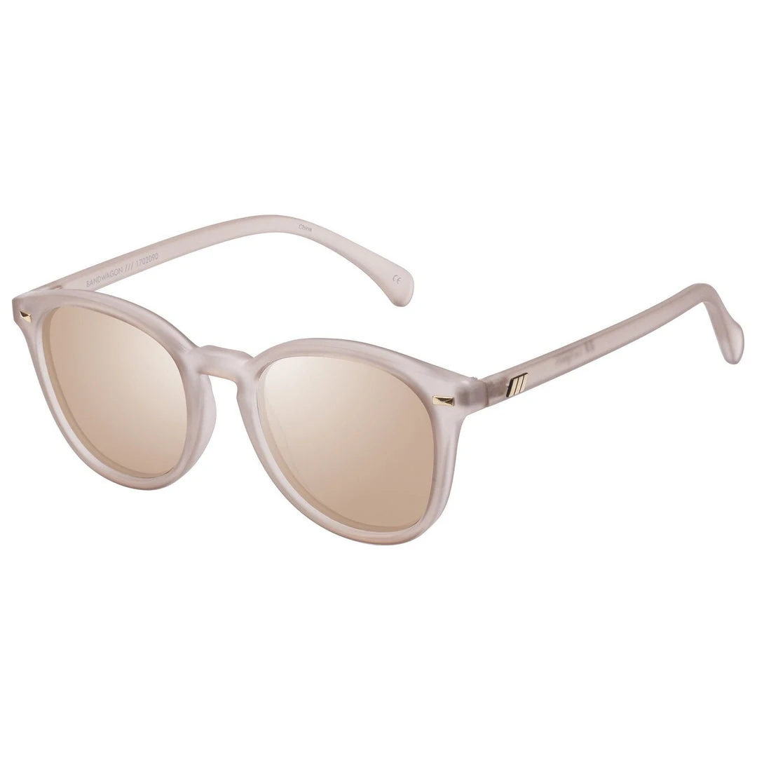 With vintage inspired details, this iconic Le Specs style in matte stone is the perfect all-round sunglass offering a timeless aesthetic. Featuring a keyhole nose bridge and refined angles, and mirror lens, this midsize style is finished with discreet metal rivet detailing and Le Specs flag stripe metal hardware.