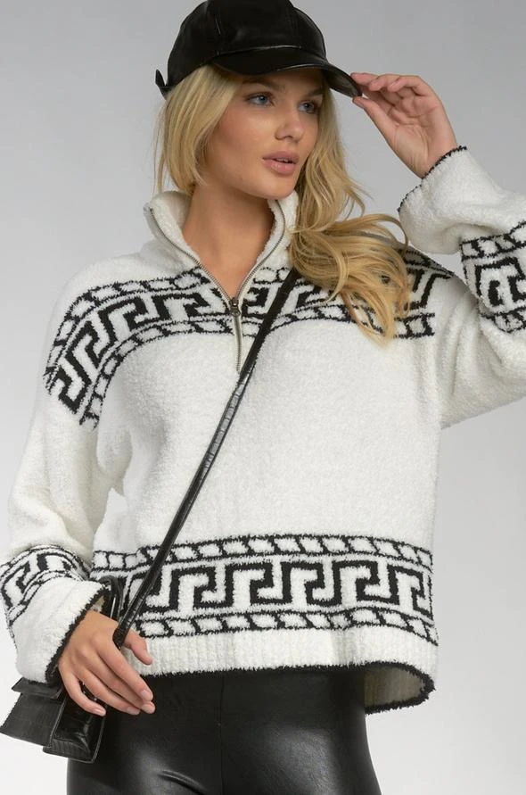 Our best-selling Viola sweater features a zippered collar and an on-trend aztec print available in 2 Fall colorways. Cute and cozy, this sweater has a loose and relaxed silhouette.