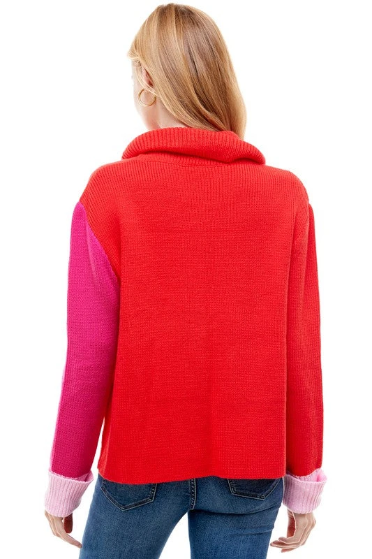 Knit sweater featuring a colorblock design and turtleneck.