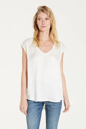 Silky sheen v-neck top finished sleeveless. Solid color woven on relaxed fit, styled with center back seam.