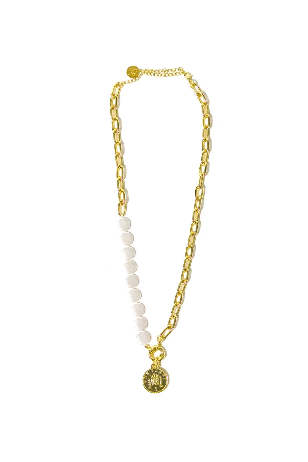 18′ Coin Pendant Necklace with Gold Chain and Pearl Accents