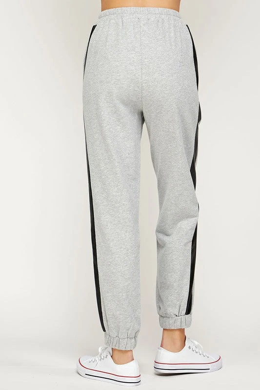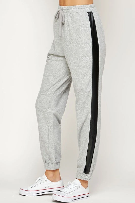 Faux Leather contrast jogger pants in knit fabric. This style features faux leather tuxedo stripe at sides, elasticated cuff, and elasticated waist with drawstring tie.