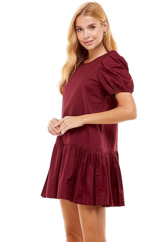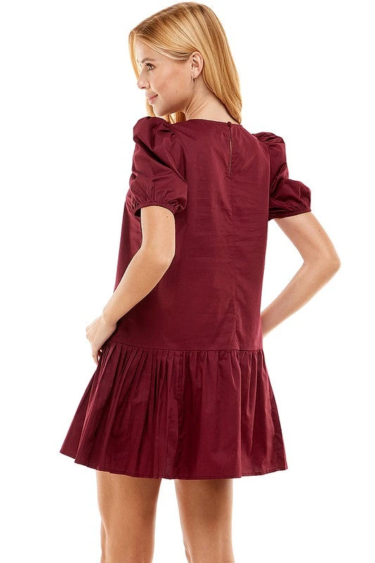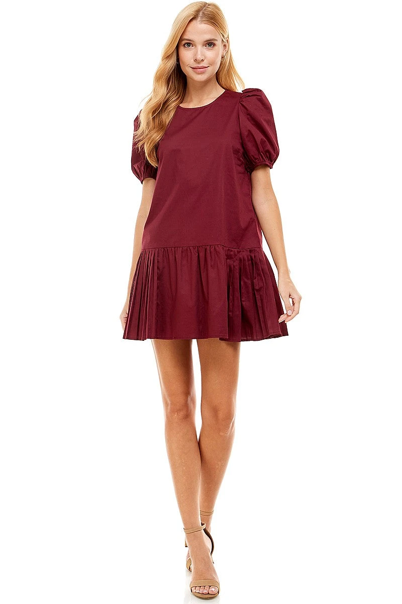Babydoll dress featuring round neckline, short puff sleeves, fit and flare silhouette.