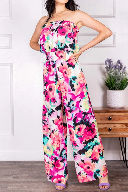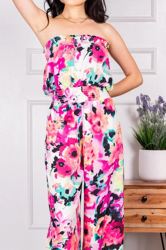 A floral print strapless jumpsuit with smocking on waistband and bust.Â