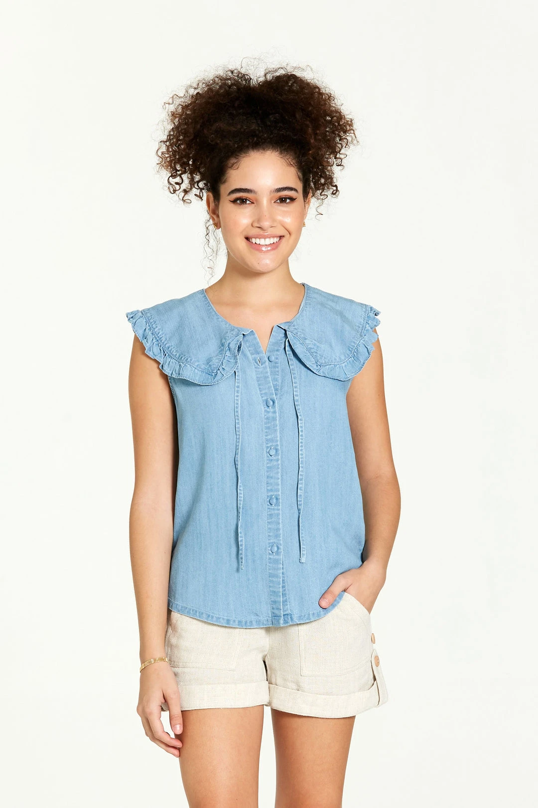 - Collar detail, Tie at neck, and buttons