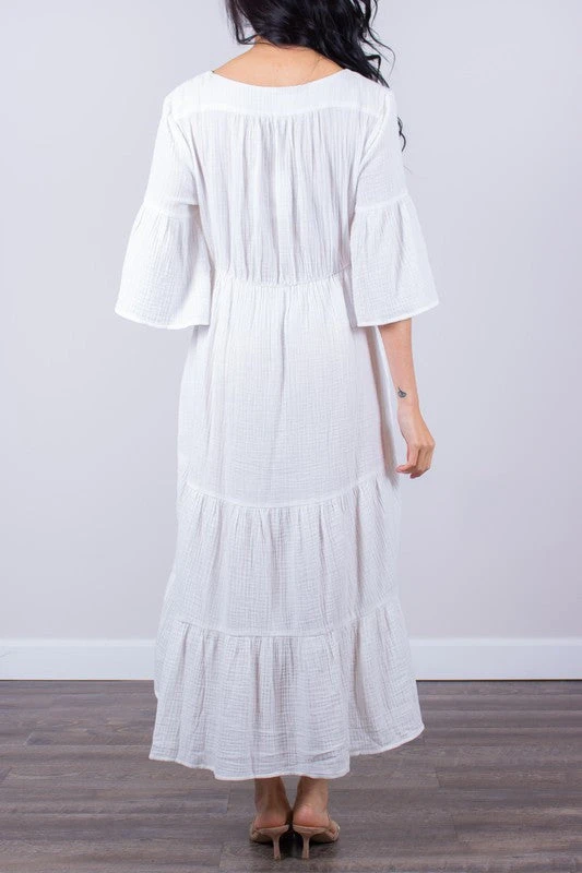 Tiered gauze mini dress with flounce sleeves, front buttons, and a v-neck.