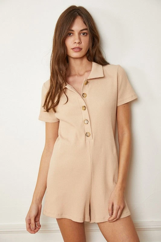 Short Sleeve Romper with Knit Ribbed Button Down and Collar Neck