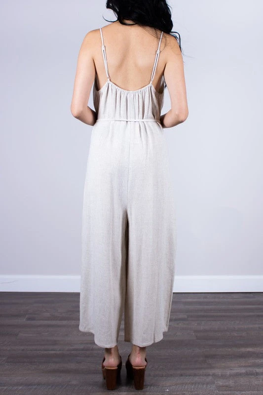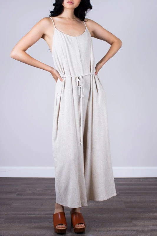 Culotte style linen jumpsuit with adjustable straps and waist-defining self-tie belt.