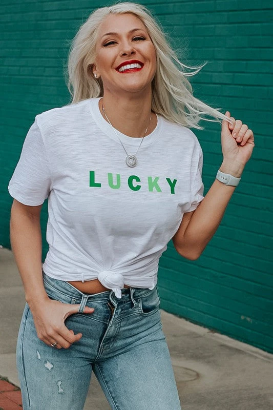LUCKY graphic tee. Signature VS look. White- Unisex. Crew neck.60/40 blend.