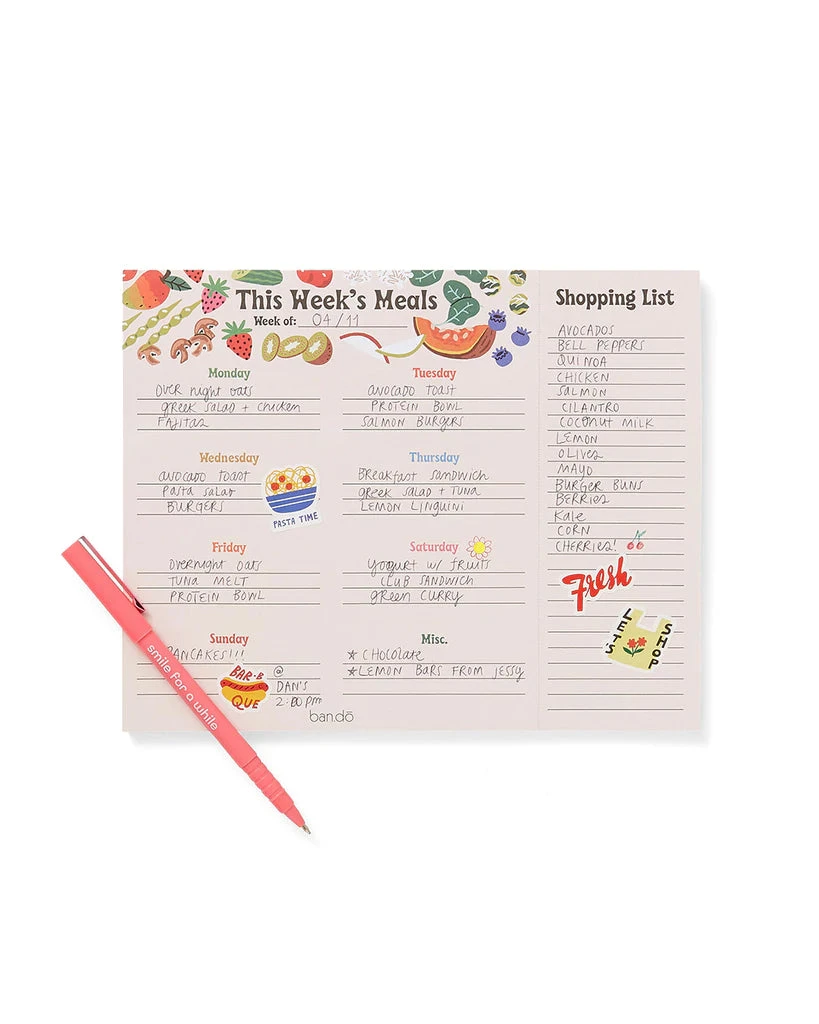 Just a joyful way to plan breakfast, lunch, and dinner. This comes with 50 pages, perforated shopping lists, and a magnetic back.