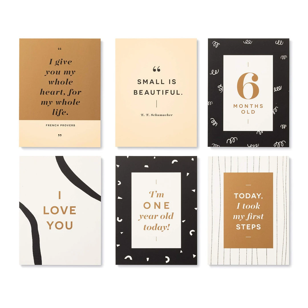 Turn your little one’s photos into beautiful mementos with these sweet milestone cards. The set offers 45 cards for capturing monthly check-ins and special moments—from first picture to first word—alongside cards with heartwarming quotes that reflect the joy of this new adventure.
