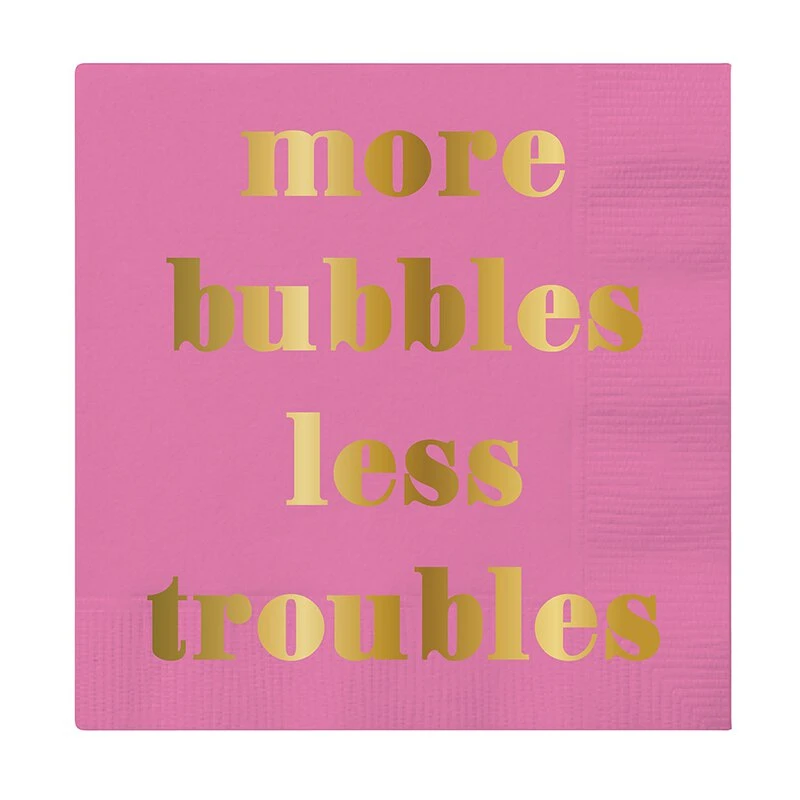- Pink napkin with “More Bubbles Less Troubles” in gold lettering