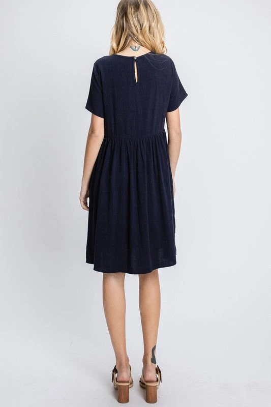 Baby Doll Style Dress With Keyhole And Button. Pockets On The Sides
