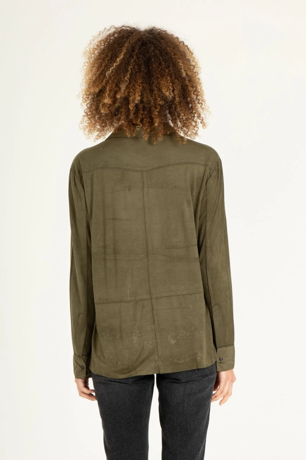 Double breasted pockets, black snap buttons, side slit, and raw hem.