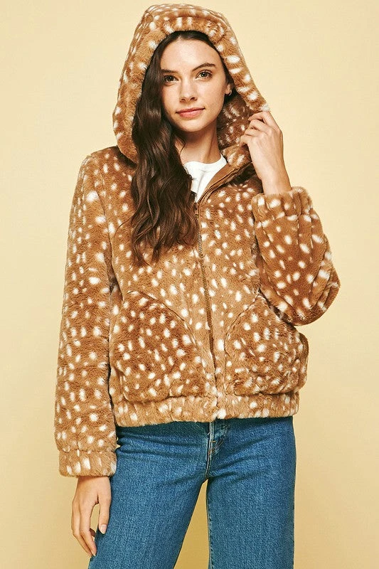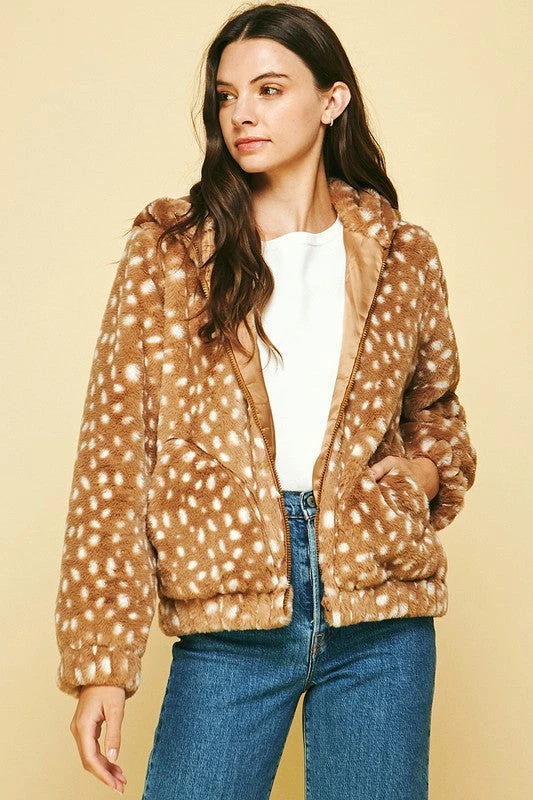 Animal Print Faux Fur, Side Pockets, Hoodie Jacket