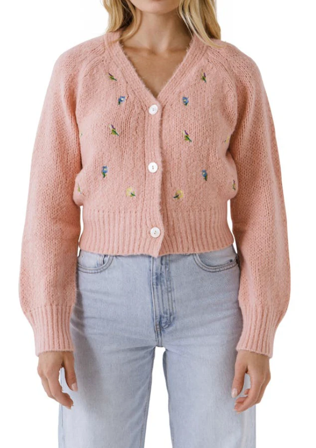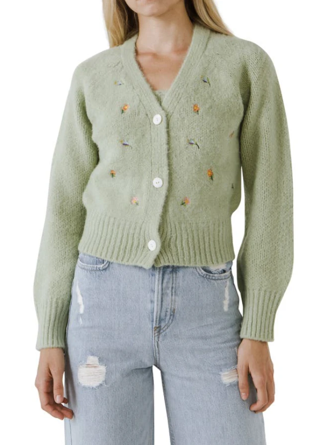 - With winsome florals and blousy sleeves, this V-neck cardigan is sweetly whimsical and perfect for cool-weather layering