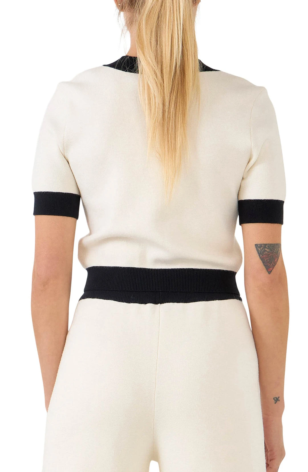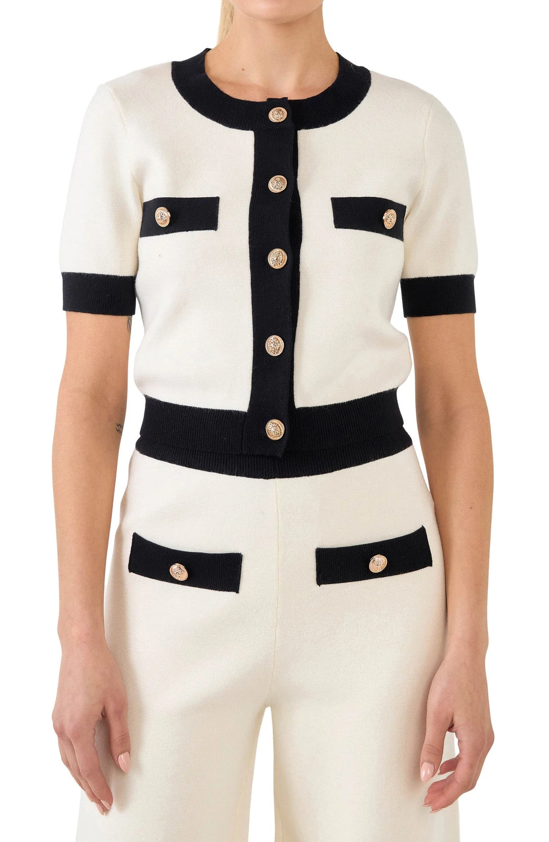 Sophisticated short sleeve cardigan sweater adorned with golden buttons.