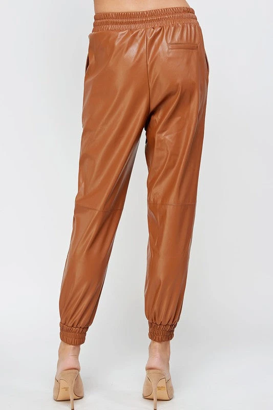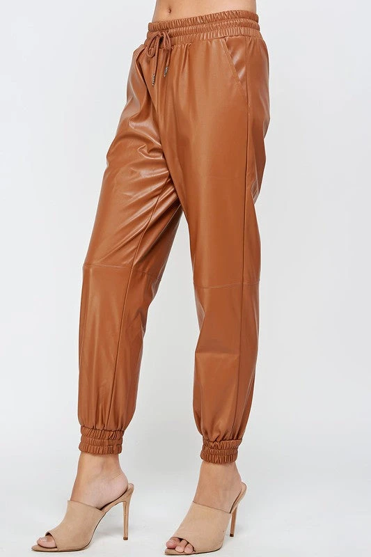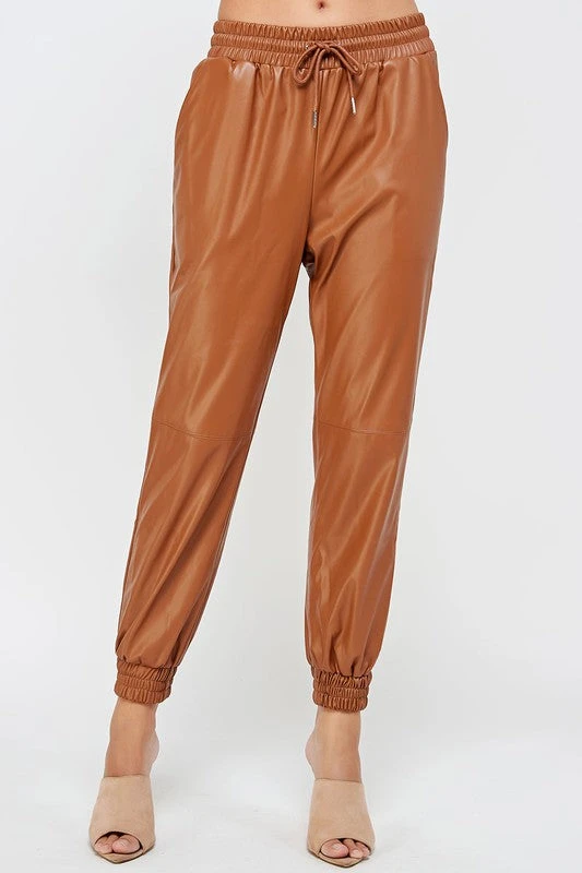 - Faux leather jogger pants. This style features an elasticated waist with drawstring ties, an elasticated cuff at the hem, and side pockets for comfort. The perfect casual chic pants for the season