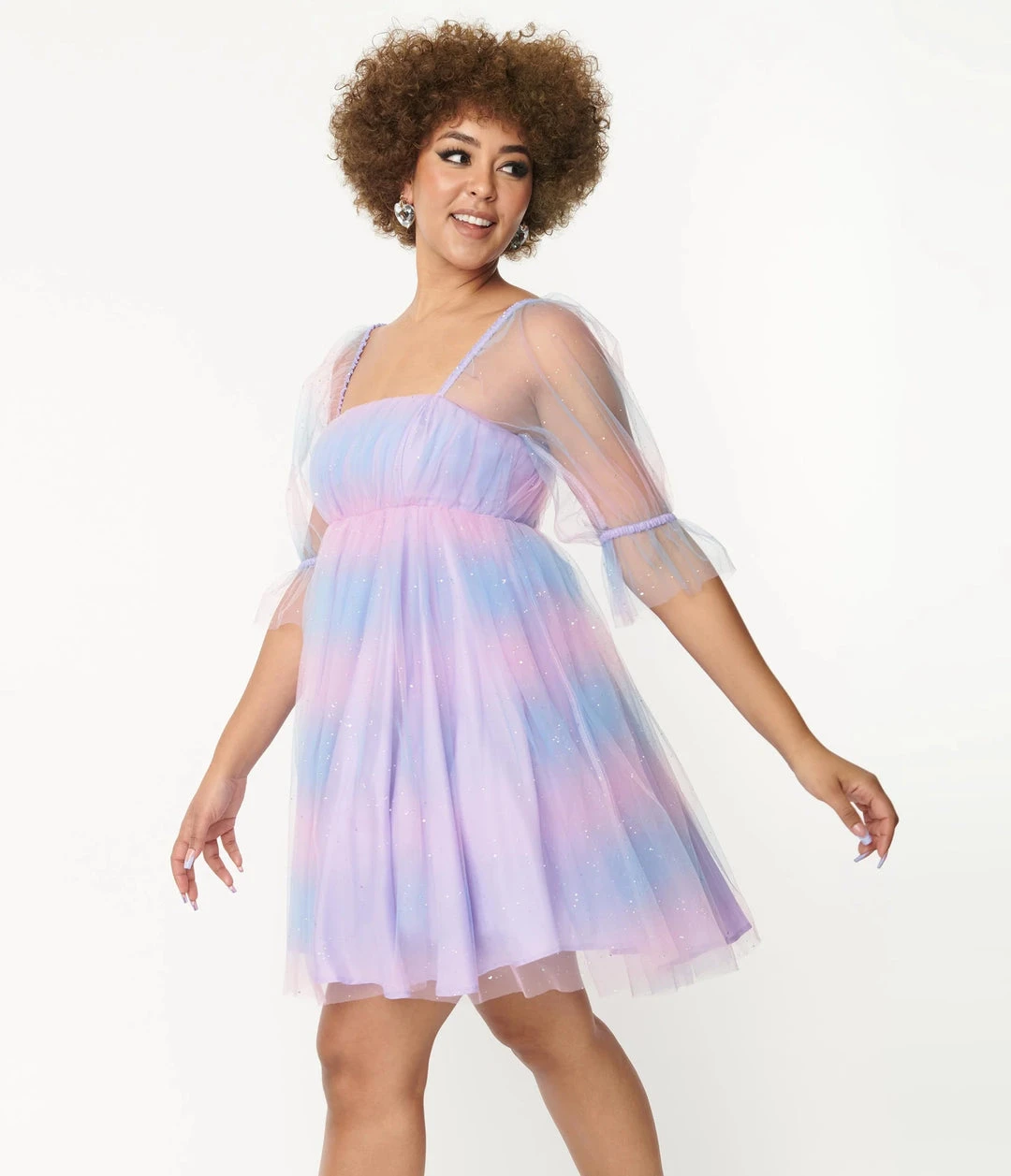 Play with their hearts in the Love Interest Dress, a fresh babydoll from Smak Parlour. Crafted in a stunning pink and purple ombre mesh and sparkling with dainty iridescent stars and moons throughout, the high empire waist is cinched with a back zipper while the square neckline is framed by puffy half sleeves, structured with elastic cuffs and shoulders for versatile wear. The flirtatious flare skirt boasts a dash of tulle of the sultry flounce while purple lining keeps you comfortable!