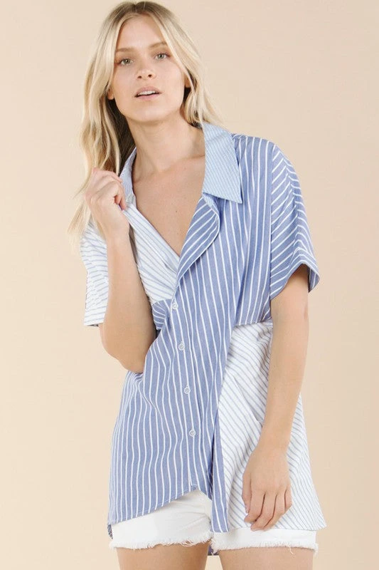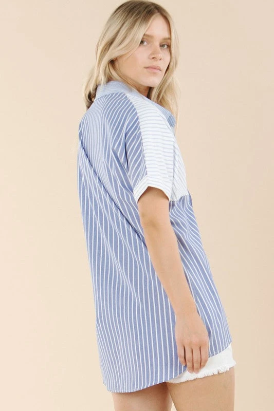 MULTI STRIPED SHORT SLEEVE COLLAR TOP WITH WAIST LOOP DETAIL