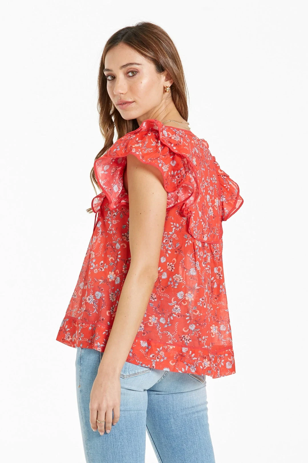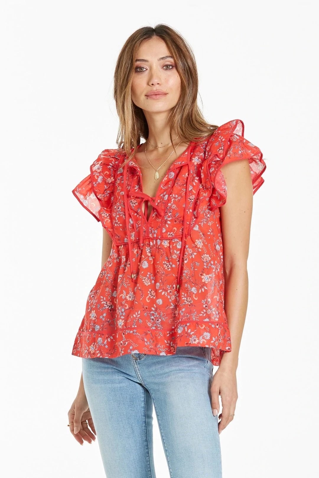 Double ruffle sleeve top, with a flutter finish and a self tie option short sleeve. Pair with our Oliva super high rise skinny jeans for a cute look that catches everyone’s attention. Multi print woven on standard fit, styled with center back seam.