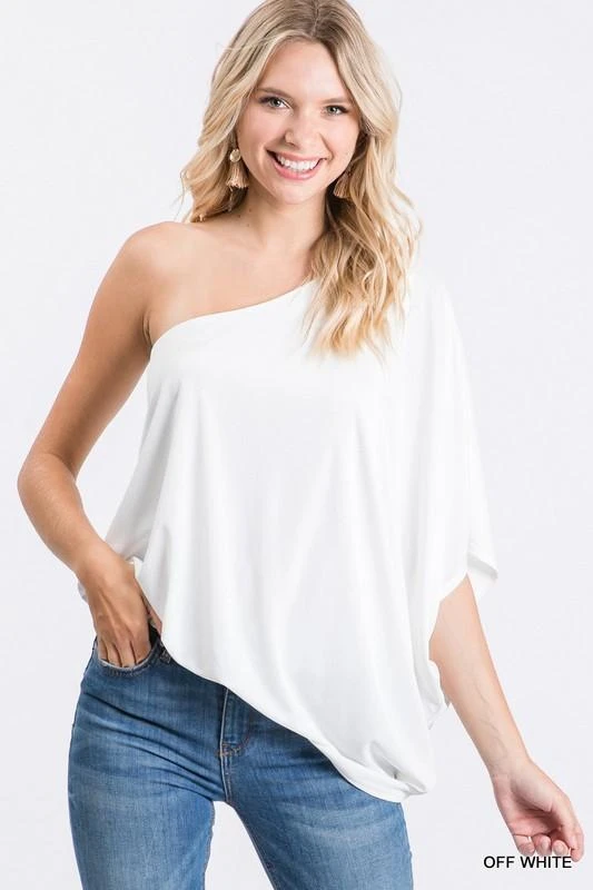 Off-the-shoulder flowy top with an elastic band waist in the interior lining.