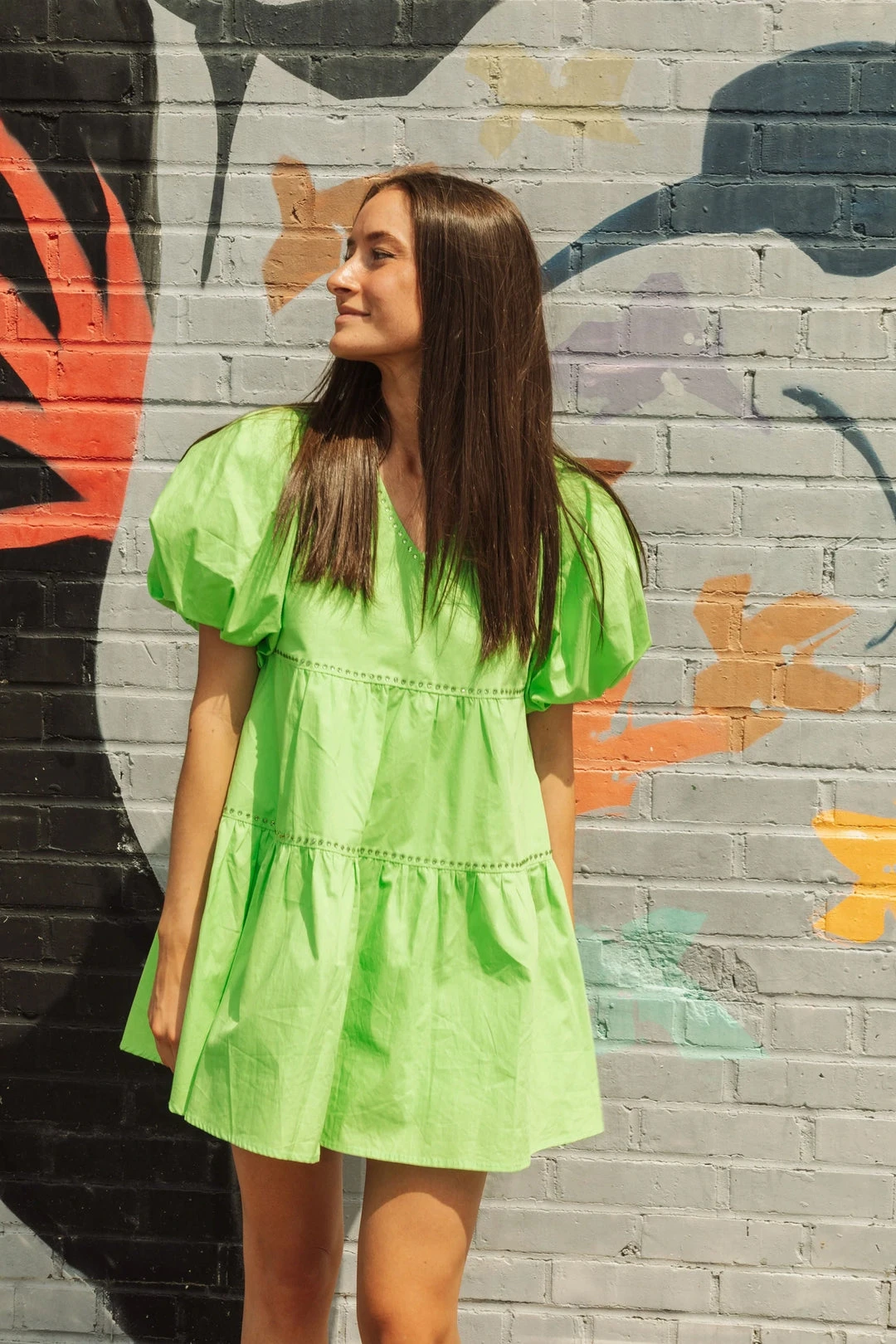 Queen of Sparkles tiered puff sleeve dress with sequin leopard on back.