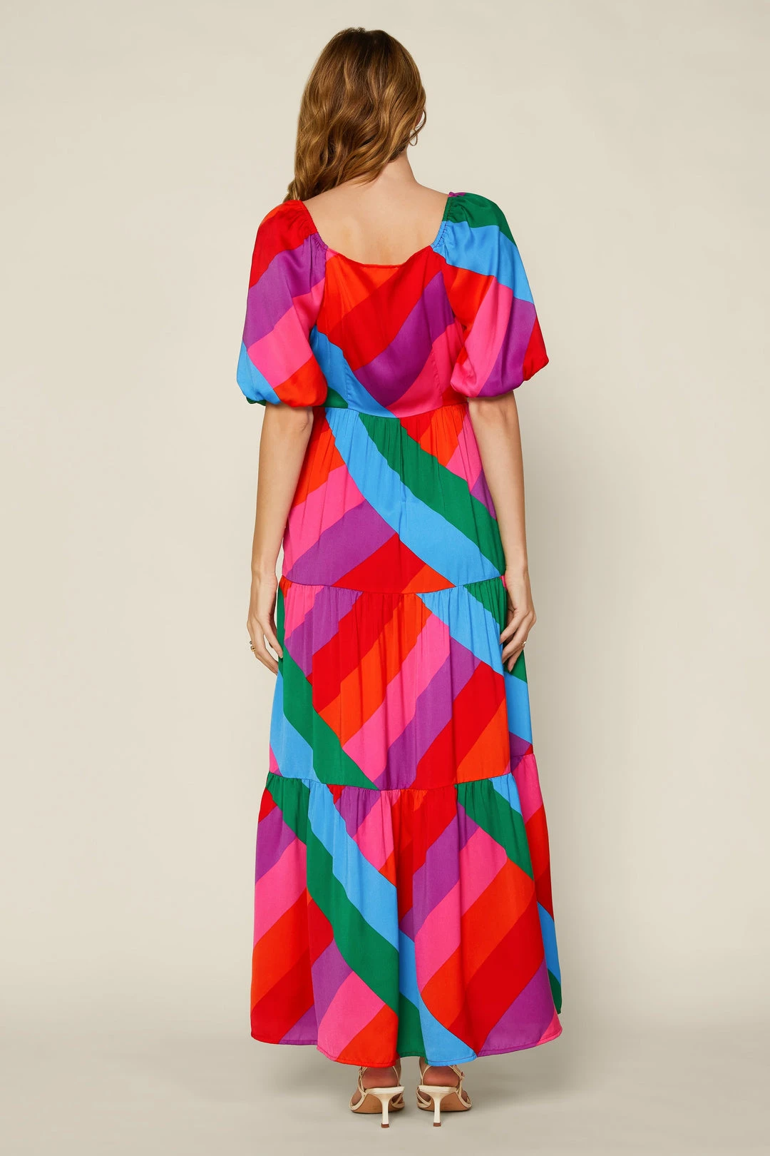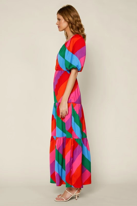 Short puff sleeve rainbow ruffle tiered maxi dress.