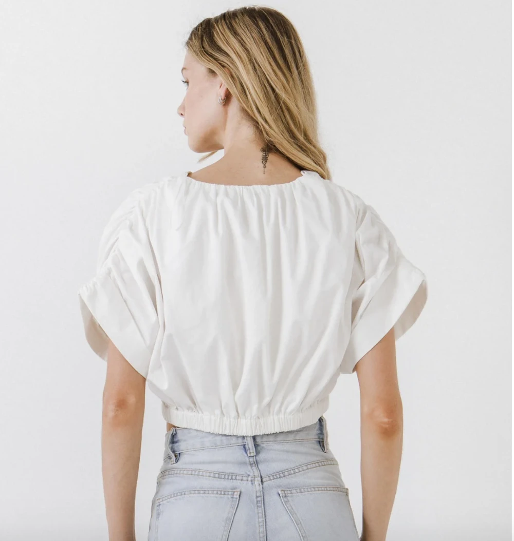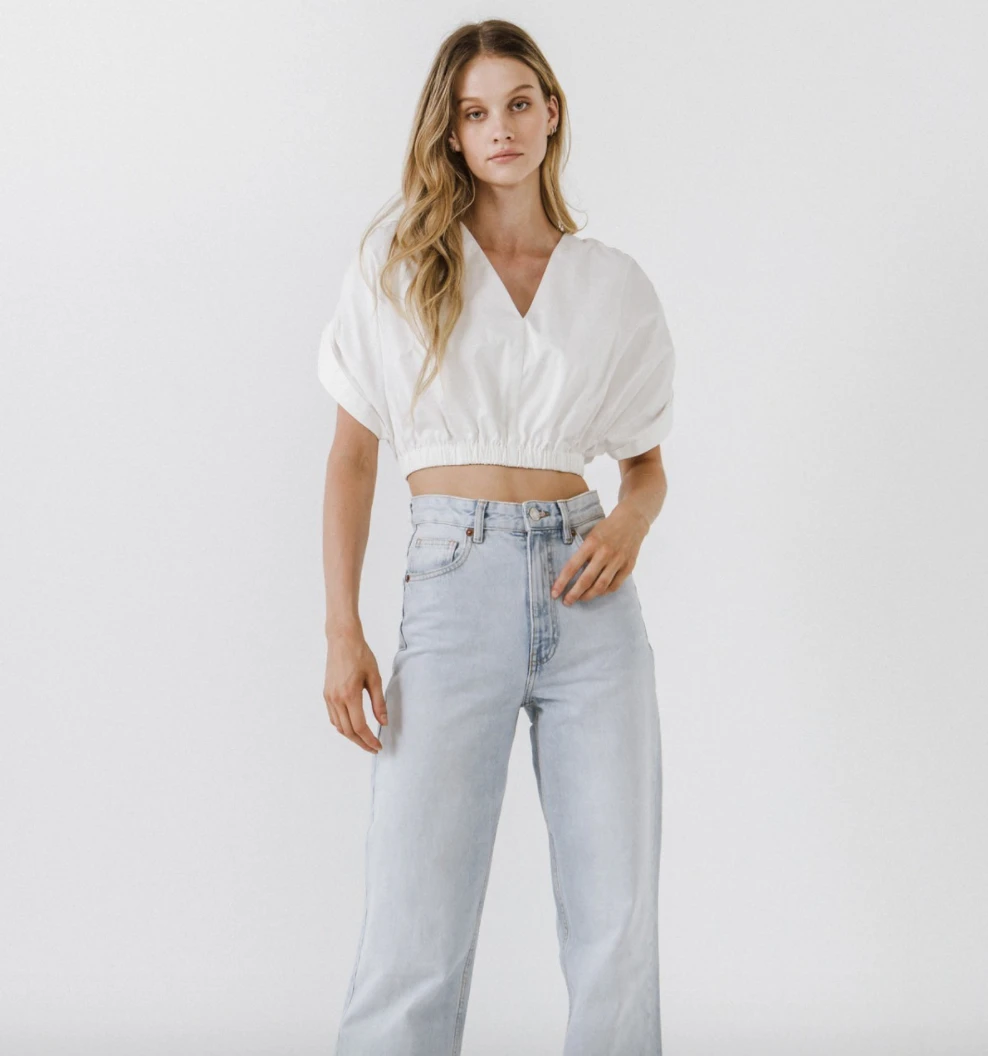 V Neckline. Back Keyhole. Ruched Shoulder Detail. Elastic Waistband. Crop Length. Drop Folded Shoulders.Â