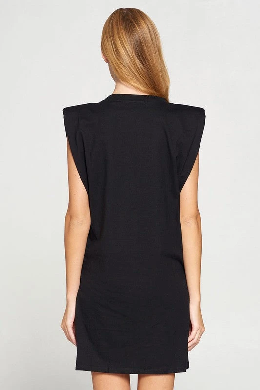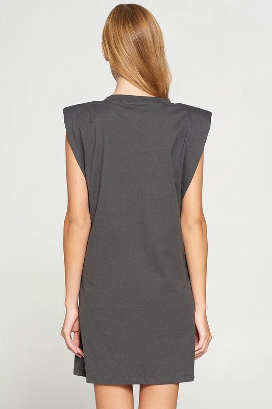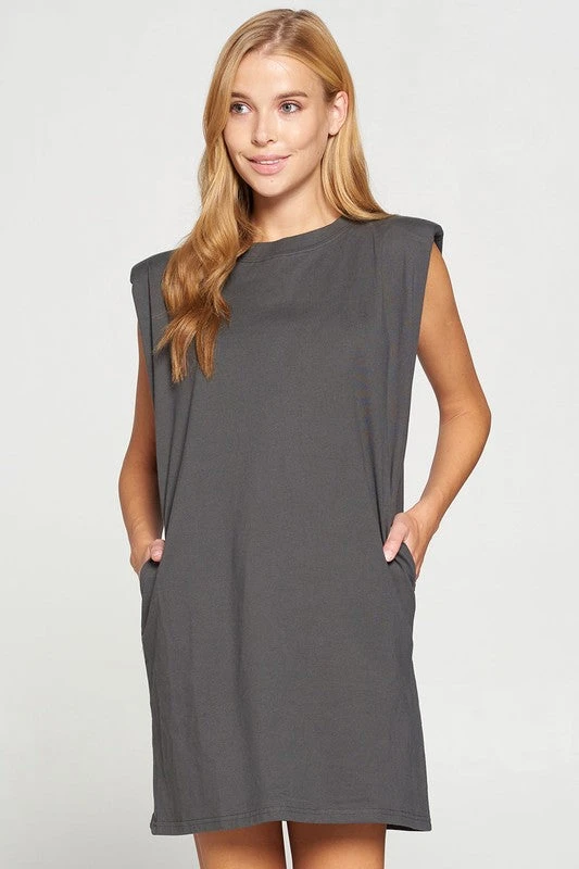 Shoulder Padded Muscle Mini Dress in cotton knit fabric. This sleeveless mini dressfeatures a crew neckline, relaxed silhouette, pockets for comfort, and padded shoulders. The perfect on trend muscle dress to dress it up, or dress it down.
