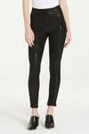 Legging finish with super high rise. It’s the essential fit that sits at the natural waist and fitted tight from waist to ankle. Ankle inseam on super stretch black fabric accented with animal print and hidden zipper at side seam & hem.