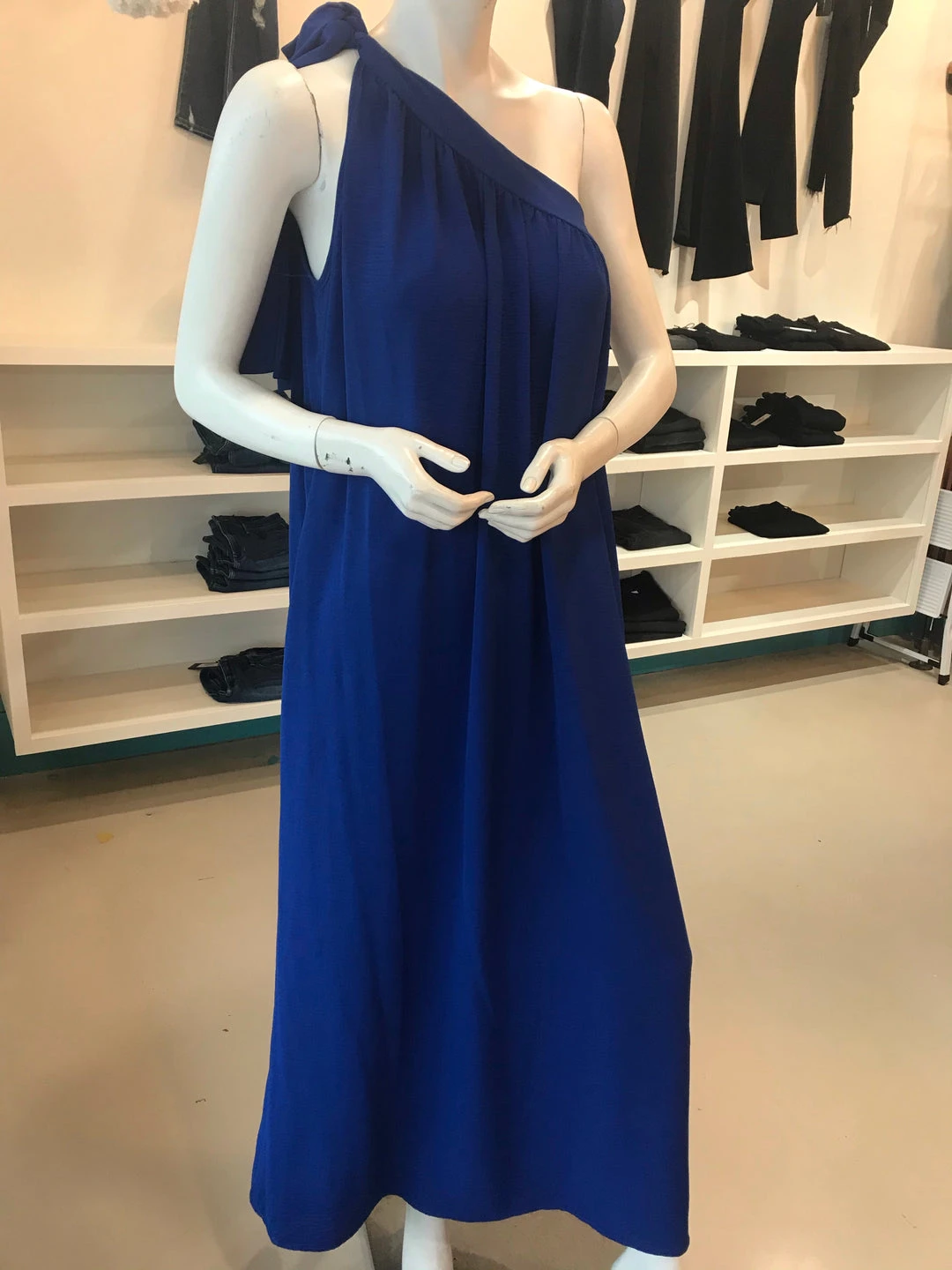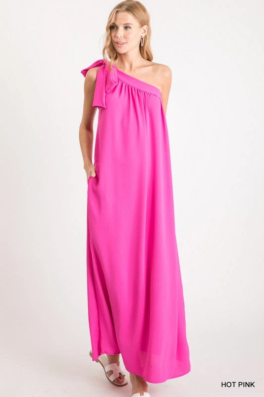 Solid One Shoulder Maxi Dress With A Self-Tie Shoulder, Ruched Neckline, And Side Pockets