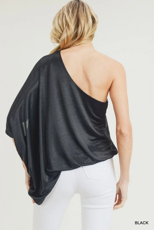 Solid Stretchy One Shoulder Top With A Dolman Half Sleeve And An Elasticized Hemline