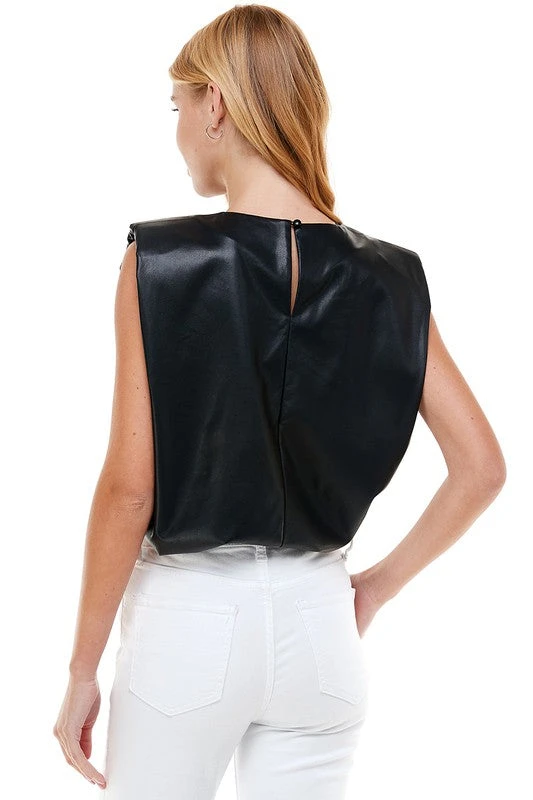 Faux leather, padded shoulder tank with back keyhole and button closures.Â