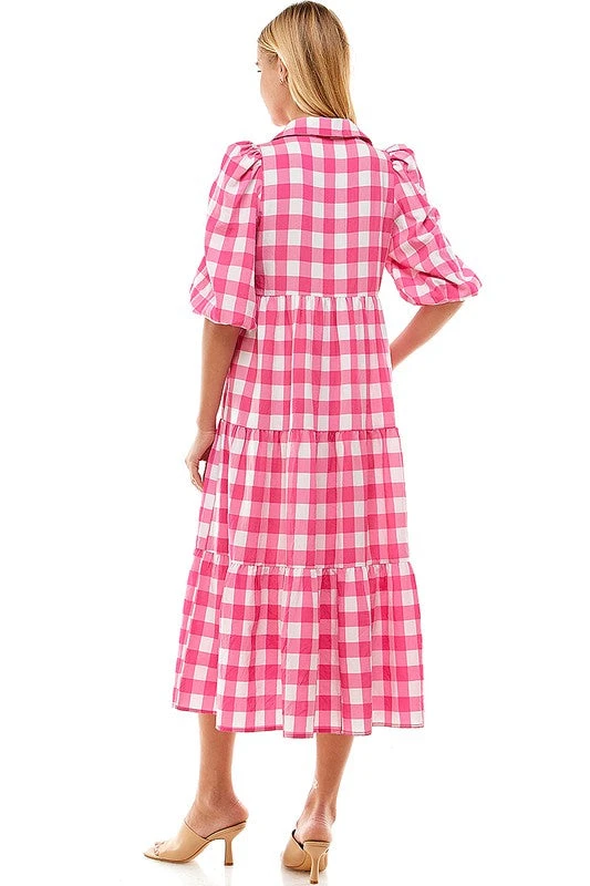 Tiered midi dress with midi length bubble sleeves, a button up design, and collar.