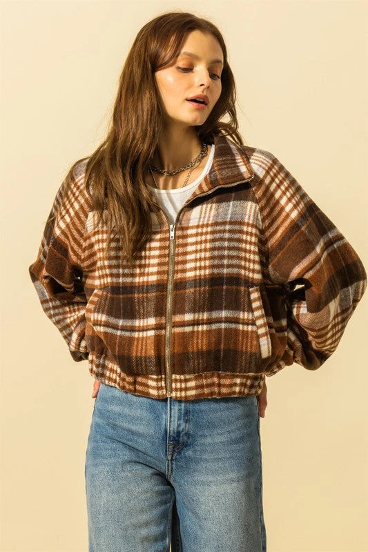 PLAID RAGLAN SLEEVE ZIP UP JACKET