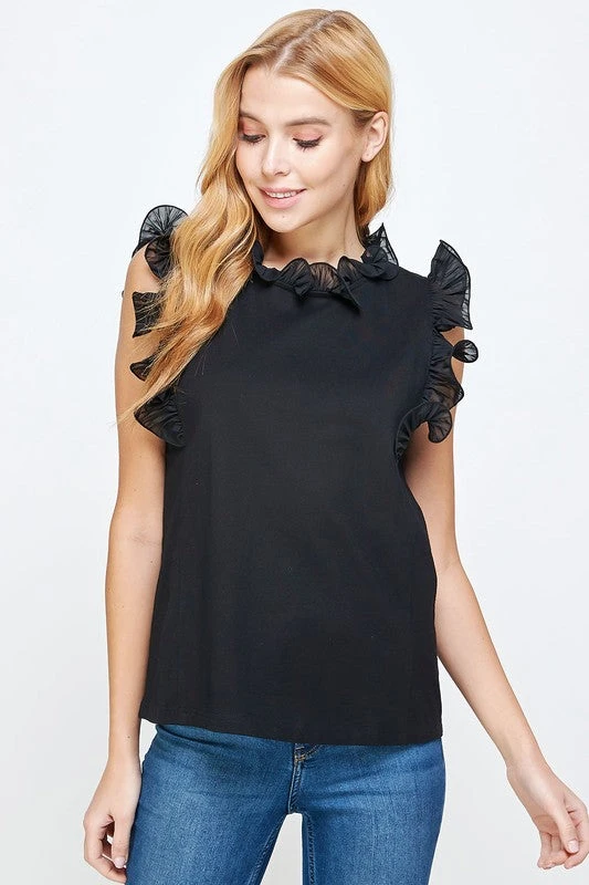 Sleeveless pleated contrast knit top. This style features a rayon knit bodice, and contrast woven pleated fabric at neck/shoulders.