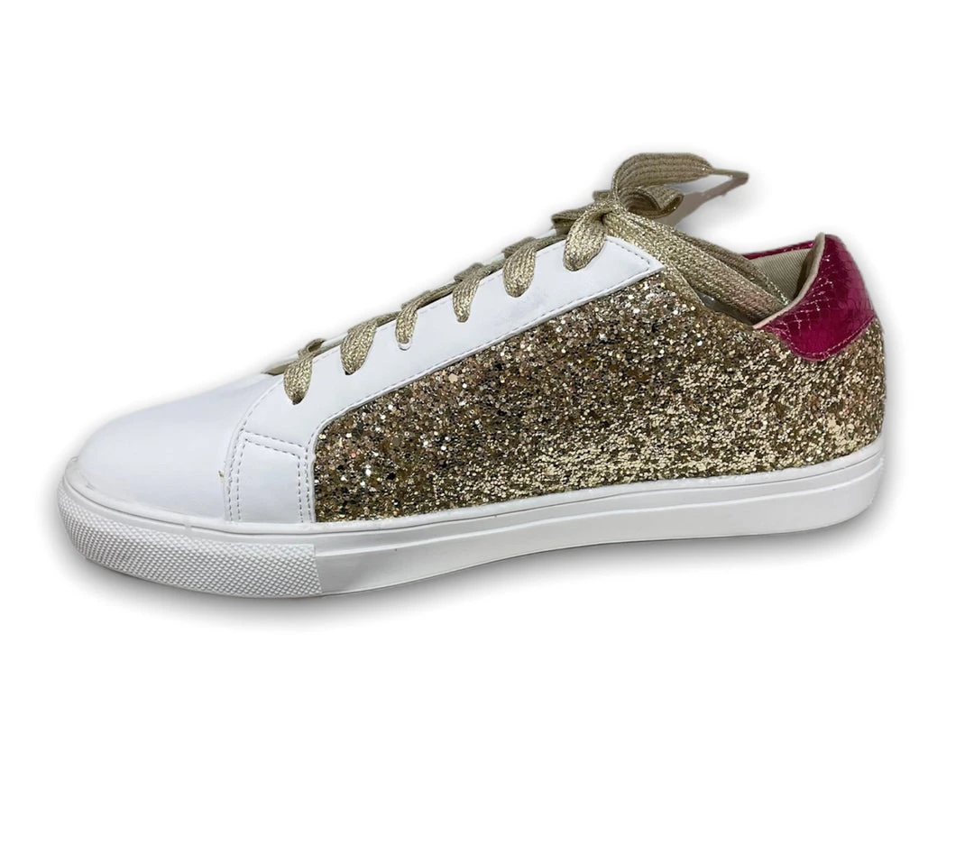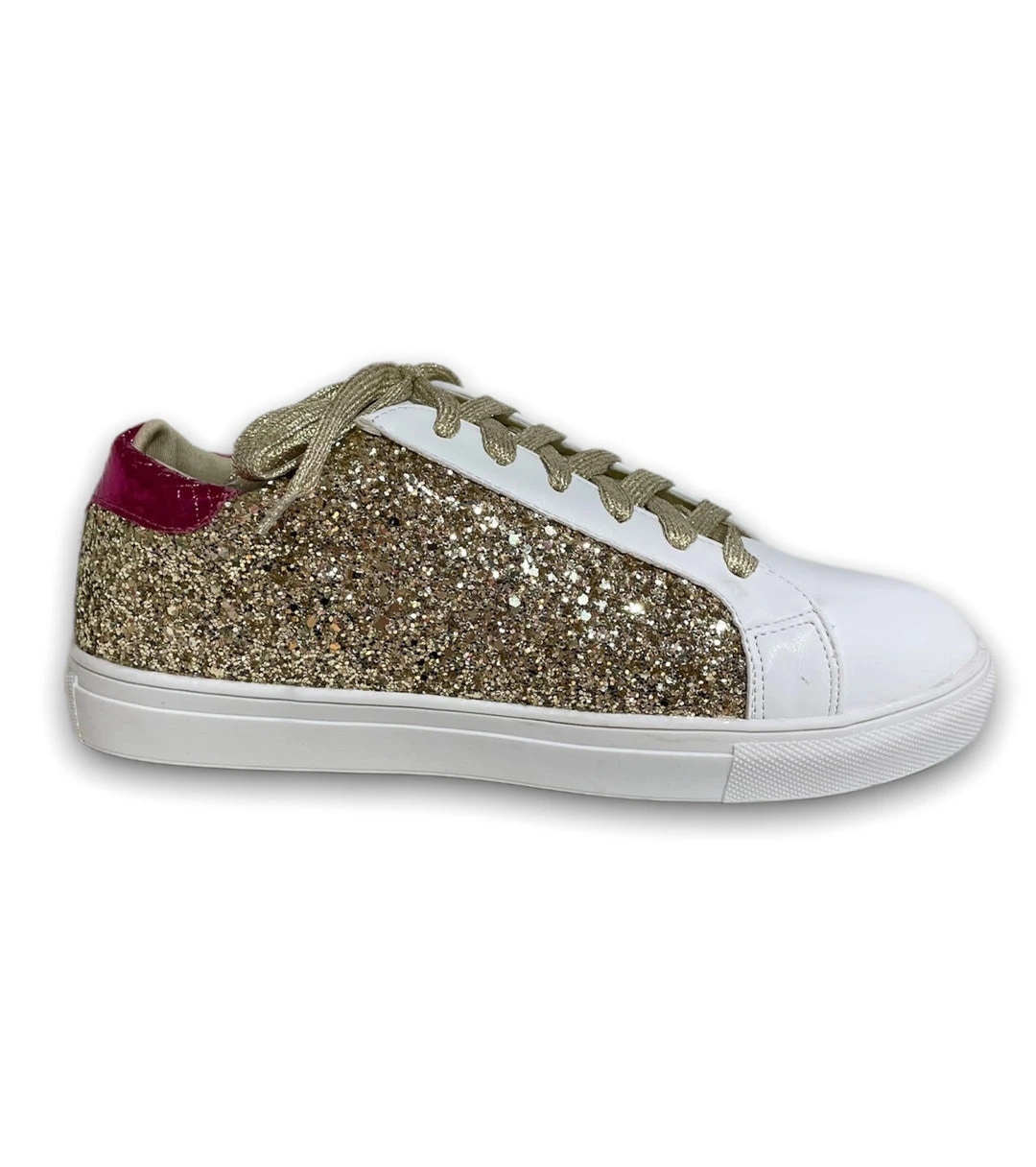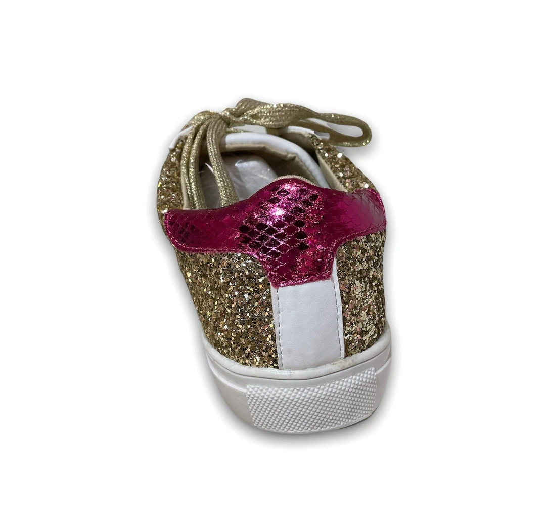 Gold glitter sneakers with shimmery pink back and gold laces.