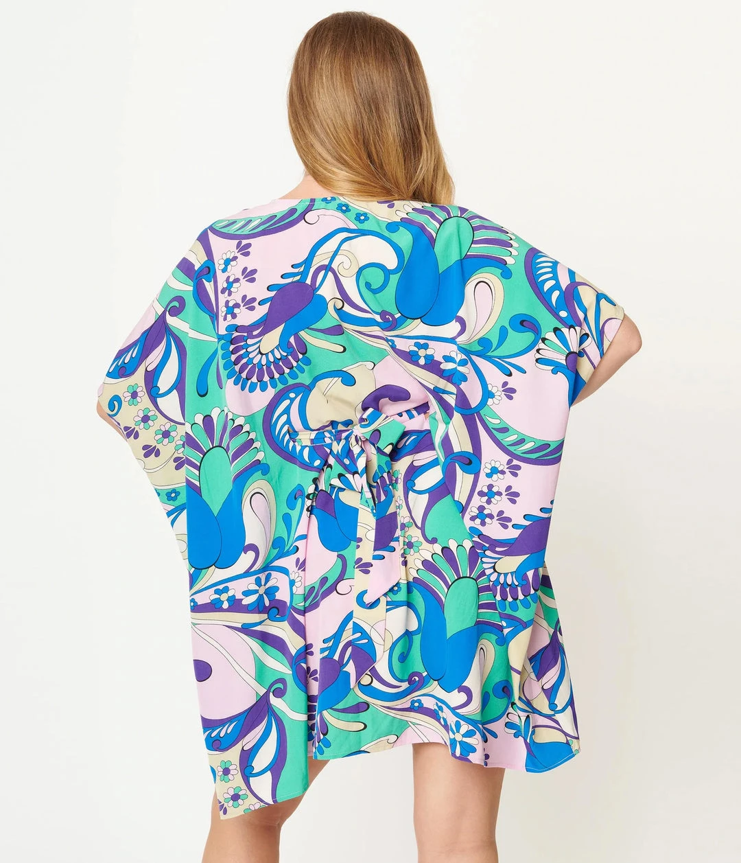 This sweet kaftan dress is crafted in lightweight fabric that dances with a retro blue, pink, and purple paisley pattern throughout a green backdrop. Nipped in the waist with self ties and complete with a hemline that drops above the knees.