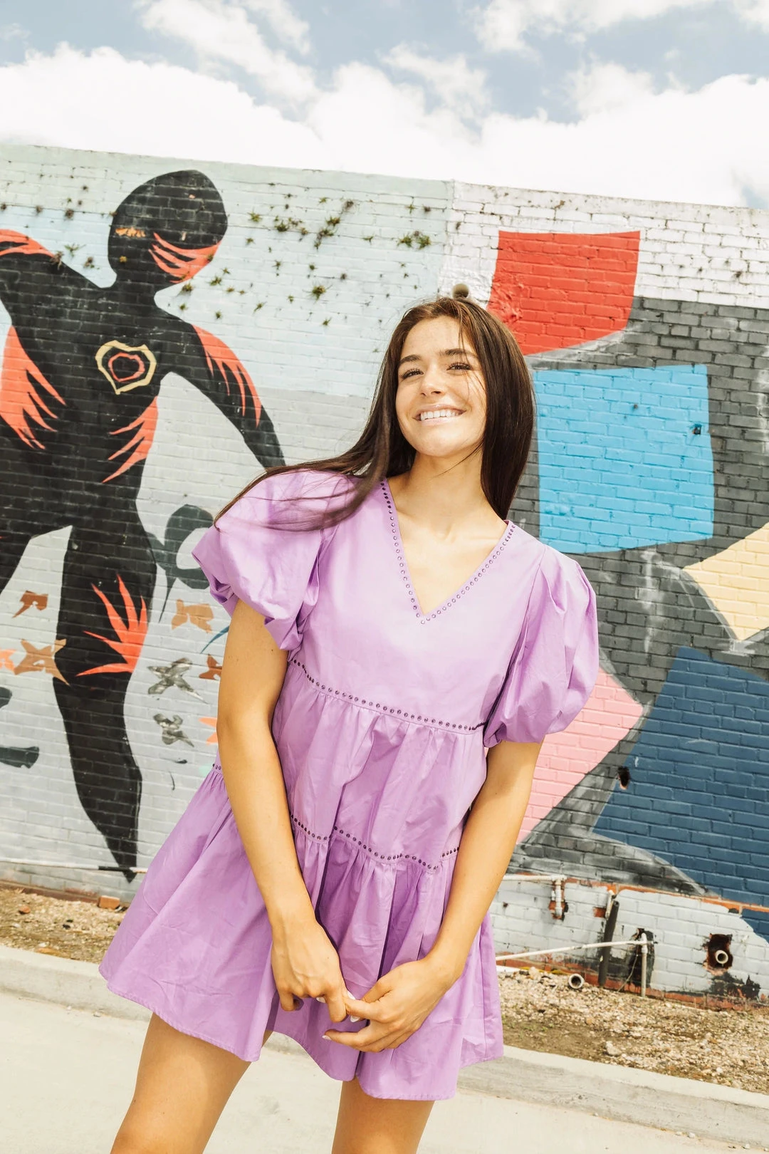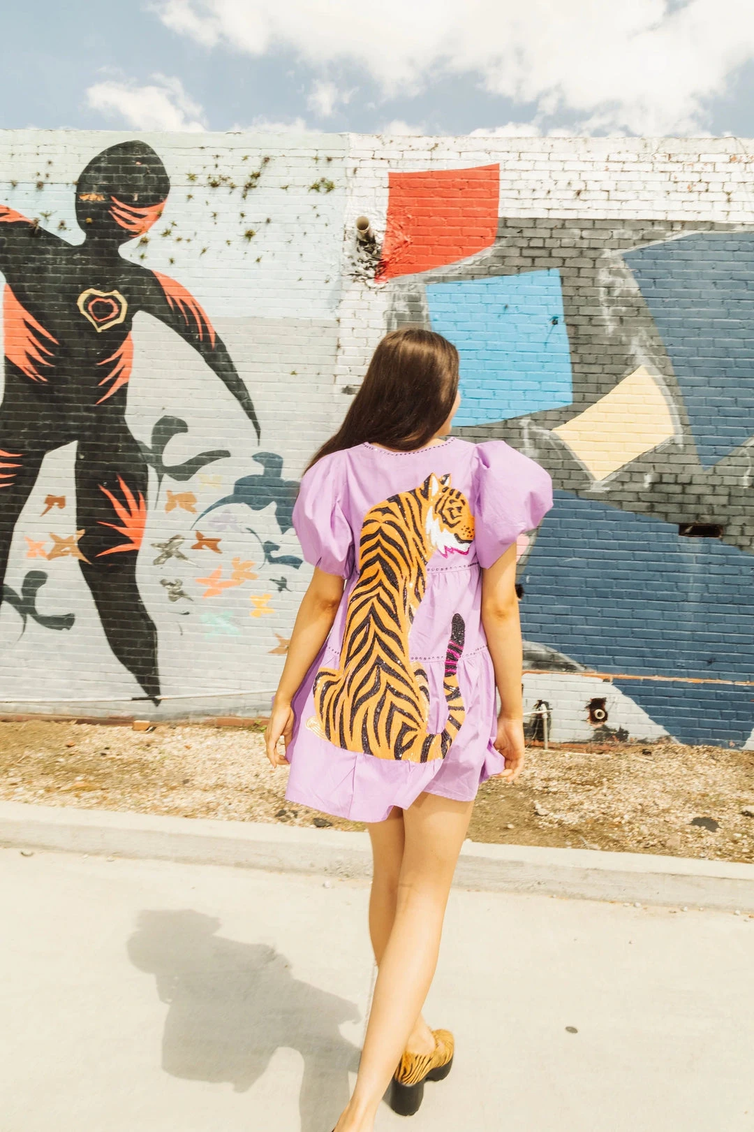 Queen of Sparkles puff sleeve tiered dress with sequin tiger on back.