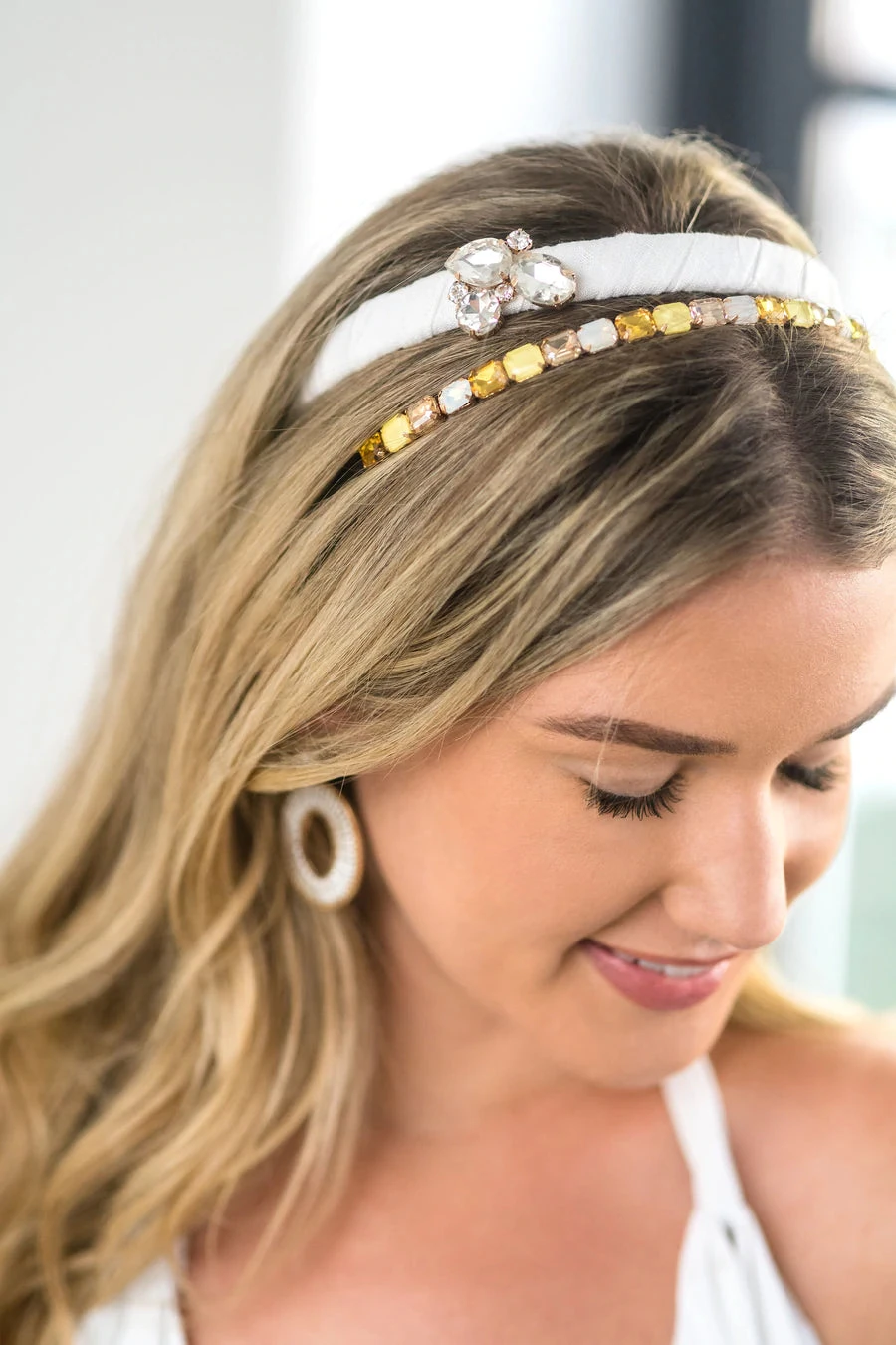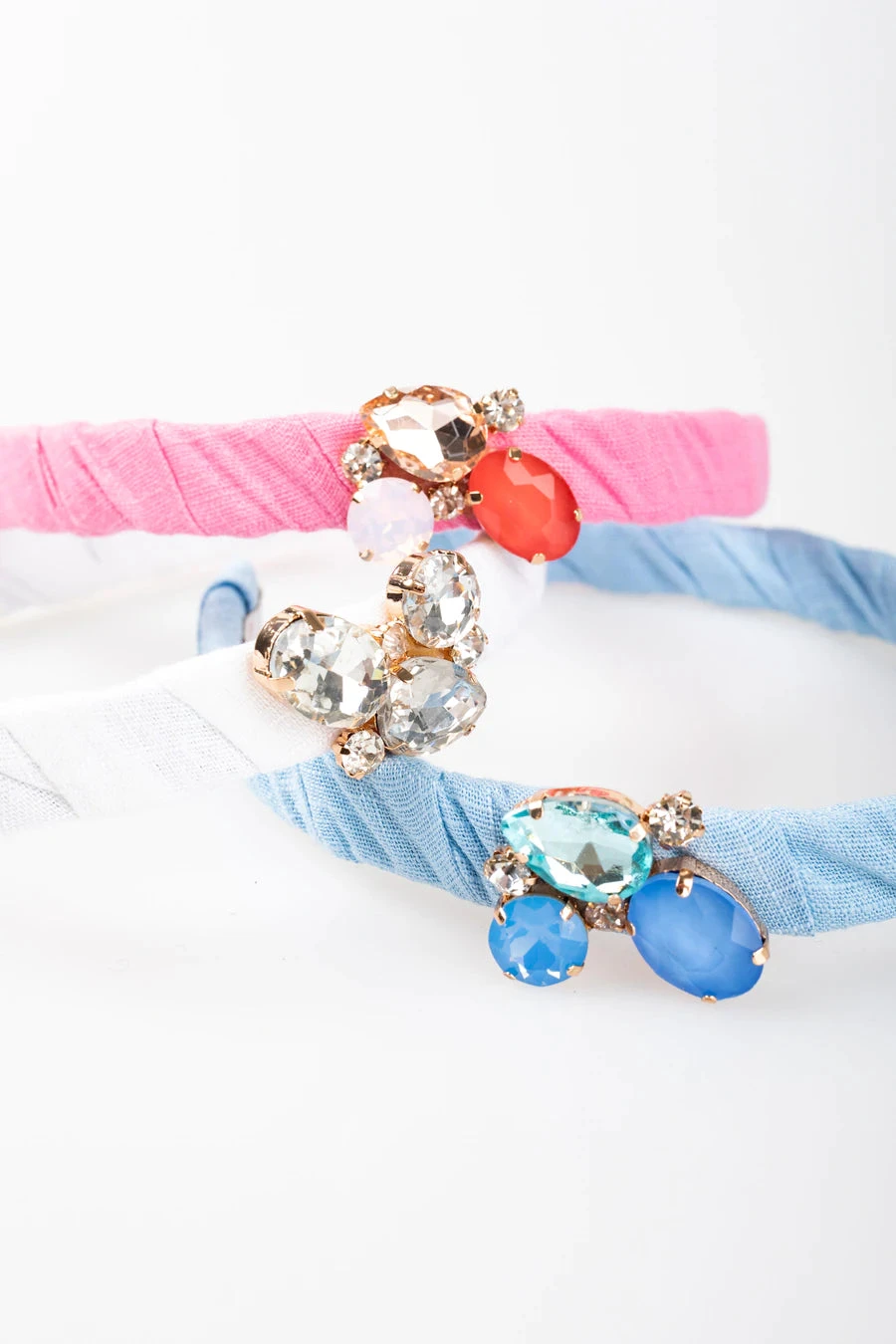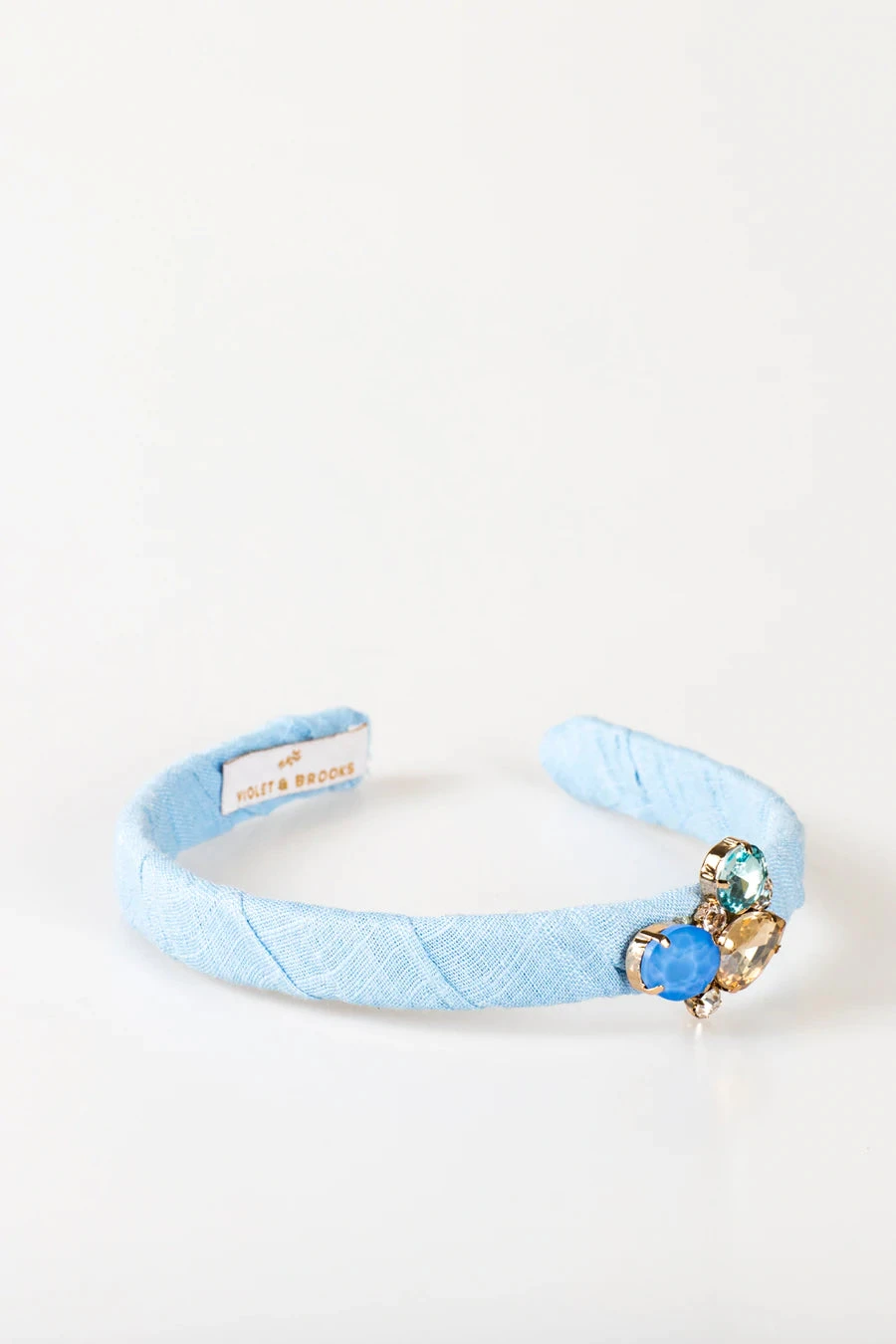 A cluster of sparkly crystals elevate this simple linen headband from casual to extra special. Easy enough to wear on the beach and out to a sunset dinner.