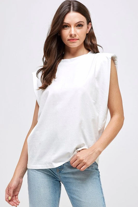 Padded Shoulder Muscle T-shirt. This Sleeveless Tee Features A Crew Neckline, Relaxed Silhouette, And Padded Shoulders. The Perfect On Trend T-shirt To Dress It Up, Or Dress It Down.