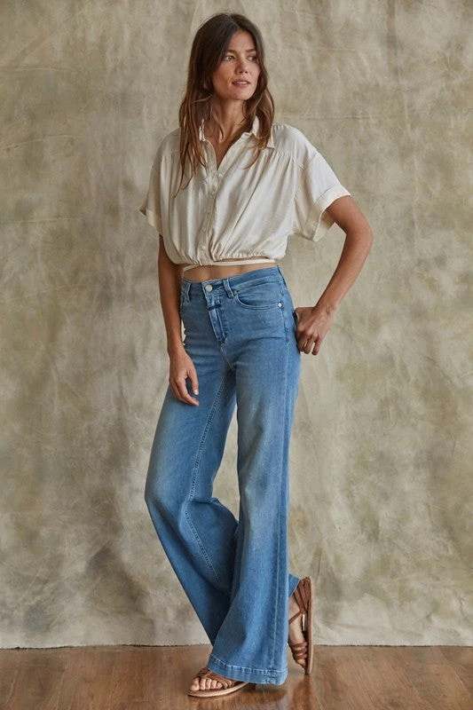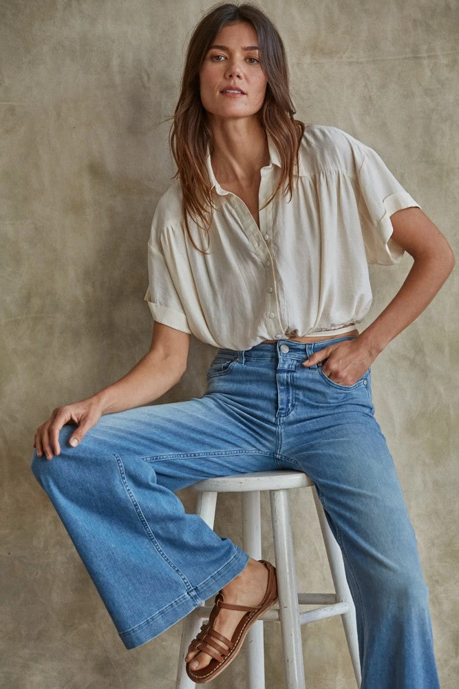 Woven Poly Satin Collared Button Up Short Sleeve W/ Tie Around Waist