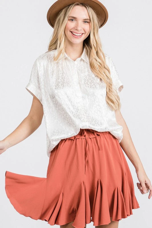 Satin leopard print button-up top with a collared neckline and short dolman sleeves.