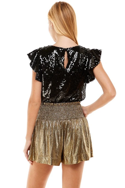 Sequin top featuring a round neck, ruffle detailed sleeve and back keyhole with button loop closures.