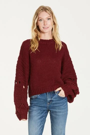 Bell long sleeve drop shoulder sweater finished with eyelet. Solid color yarn on relaxed fit, styled with self ribbed neck, cuff & bottom band.