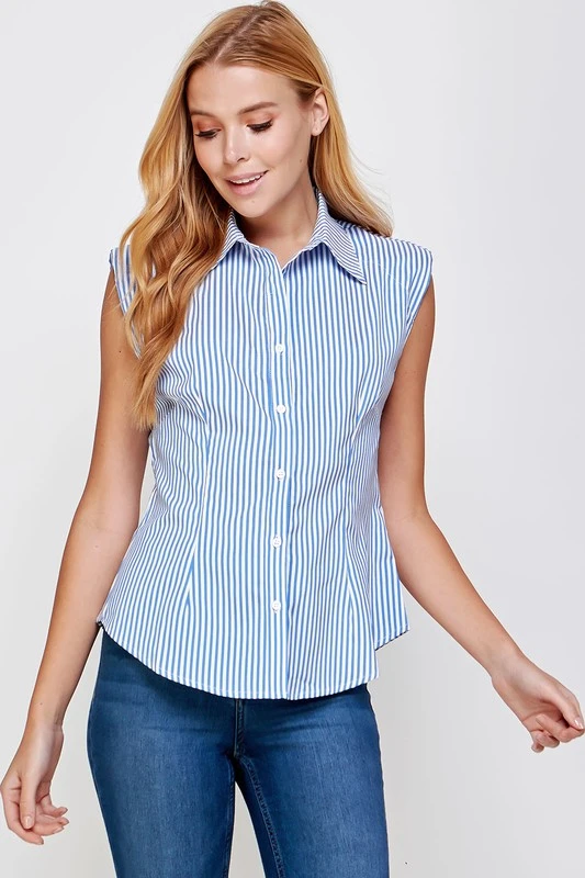 This sleeveless shirt features shoulder pads, front button up placket, and spread shirt collar.
